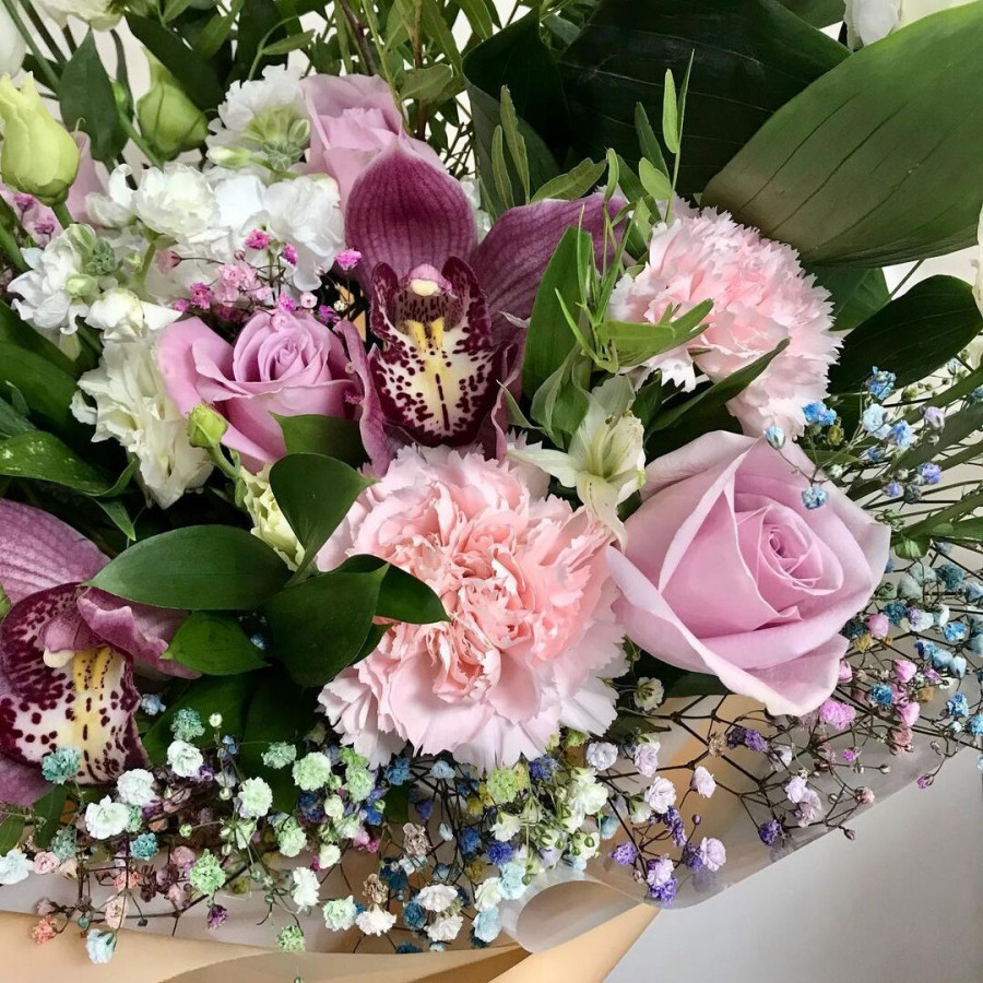 На фото бизнес-букет с орхидей. В составе: орхидея 4 шт, роза 3 шт, гвоздика 4 шт, эустома (лизиантус) 4 шт, крафт-бумага 1 шт, атласная лента 1 шт, . Все цветы свежие и ароматные, букет красиво оформлен и отлично подходит для подарка. Доступна доставка цветов или самовывоз.