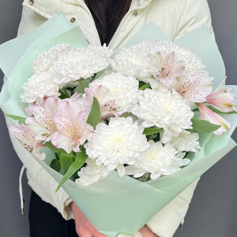 На фото букет «белая акварель». В составе: альстромерия 2 шт, хризантема кустовая 3 шт, дизайнерская упаковка 1 шт, атласная лента 1 шт, . Все цветы свежие и ароматные, букет красиво оформлен и отлично подходит для подарка. Доступна доставка цветов или самовывоз.