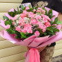 На фото букет из розовой кустовой гвоздики. В составе: гвоздика кустовая 11 шт, гипсофила 2 шт, аспидистра 2 шт, крафт-бумага 1 шт, атласная лента 1 шт, . Все цветы свежие и ароматные, букет красиво оформлен и отлично подходит для подарка. Доступна доставка цветов или самовывоз.